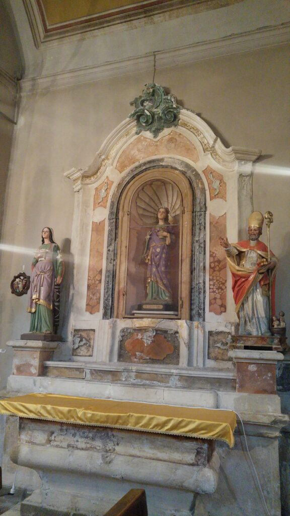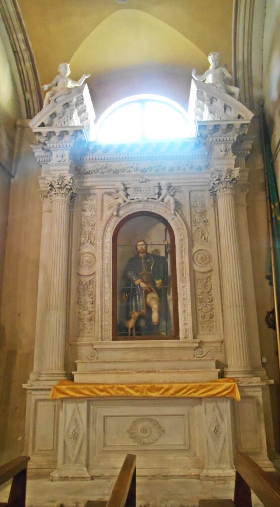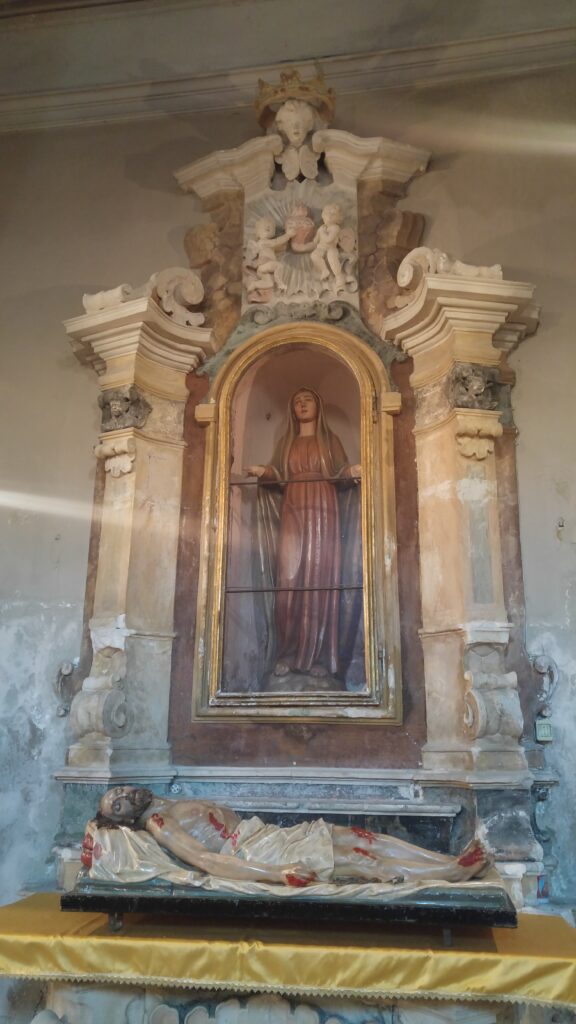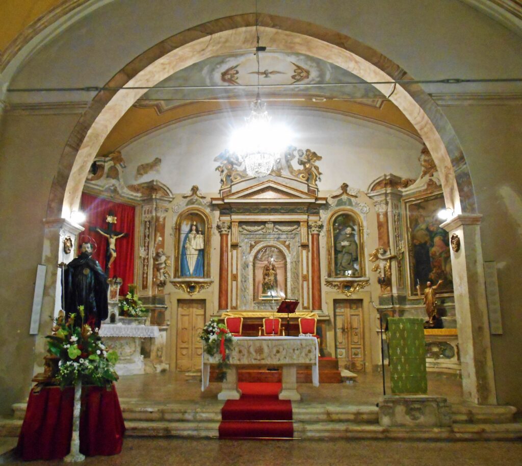 The Church of the Madonna delle Grazie, located on the square of the same name, dates from the 13th century, but has undergone repeated alterations over time. The façade is adorned by a rose window, an architrave with a sculpture of an agnus dei, and two 16th century statues placed in niches above the main entrance, on either side. The main entrance consists of a simple rectangular portal surmounted by an ogive-shaped tympanum originally adorned by a fresco. On the right lateral wall of the church is another rectangular entrance dating back to 1552. The single-nave interior, which was significantly altered in the 18th century, has some well-preserved frescoes from the 16th century depicting the crucifixion and deposition of Christ, as well as a triptych portraying Saint Anthony, Mary Magdalene and Saint Amico.