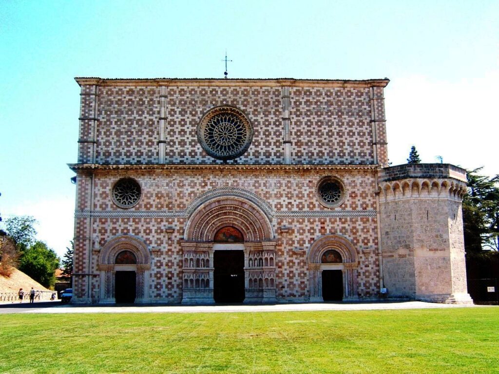 - The basilica of Santa Maria di Collemaggio, a church in the Romanesque style built in 1288 at the request of Pietro da Morrone, who became Pope Celestine V. It was the site of papal investitures and hosts an annual jubilee.