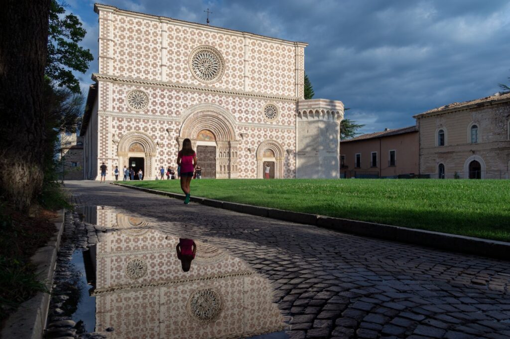- The basilica of San Bernardino, built after the saint’s death in 1444 to house his remains. It has a superb Renaissance façade designed by Cola dell’Amatrice. The interior, rebuilt in the Baroque style after the 1703 earthquake, houses the San Bernardino mausoleum and the Camponeschi family mausoleum. The basilica, which is reached by climbing a massive staircase, is located near Corso Vittorio Emanuele II.