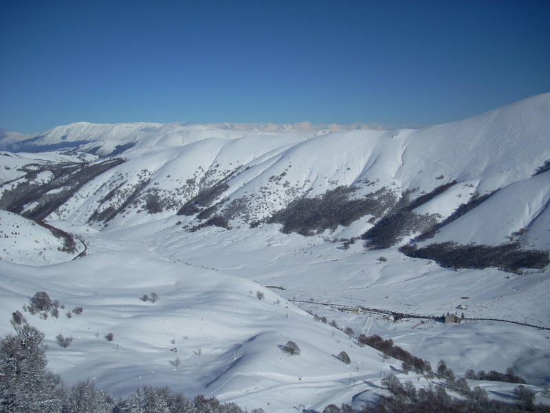 - Campo Imperatore, 127 km – 1h 33min: The historic Campo Imperatore Hotel (2130 m), with its view of the Corno Grande (at 2912 m, the tallest peak in the Gran Sasso and the Apennines), is at the centre of the highest ski terrain in Abruzzo (its ski lifts reach 2233 m on Mount Scindarella). The high elevation means there is excellent snow cover much of the winter. The Campo Imperatore plateau offers good opportunities for cross-country skiing, while the Gran Sasso slopes offer countless possibilities for downhill skiing, off-piste skiing and ski mountaineering. The resort is in the middle of the Parco Nazionale del Gran Sasso e Monti della Laga and is the site of the southernmost glacier in Europe, the Calderone. It has 60 km of cross-country trails, including the one in Santo Stefano di Sessanio (near Lake Racollo), those in Castel del Monte (at the eastern end of the plateau, between the Piano di Cretarola and the Fonte Pietrattina), and the loop around the three ponds, which winds along the edge of the plateau. In addition to skiing, there is rock climbing (natural and artificial) and dog sledding, as well as snowshoeing and snowboarding (lessons are provided). It is possible to reach this spectacular plateau year-round by car, or by taking the cable car in Assergi (an ascent of more than 1000 m).