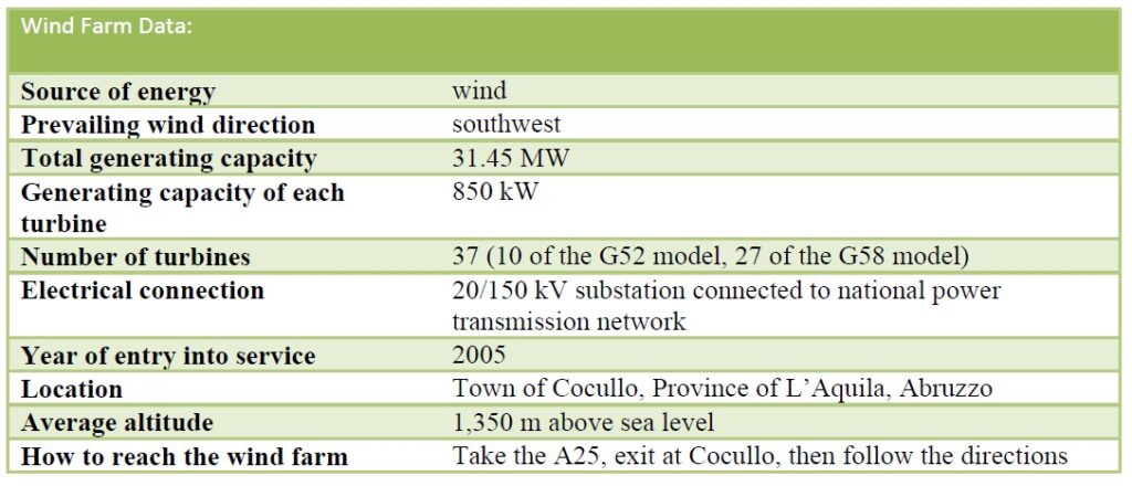 The construction of a wind farm in Cocullo is highly symbolic, not only because it is located in the province of L’Aquila, in the heart of Abruzzo, which has been designated a European Green Region, but also because it was completed only a few weeks after the Kyoto Protocol came into force.