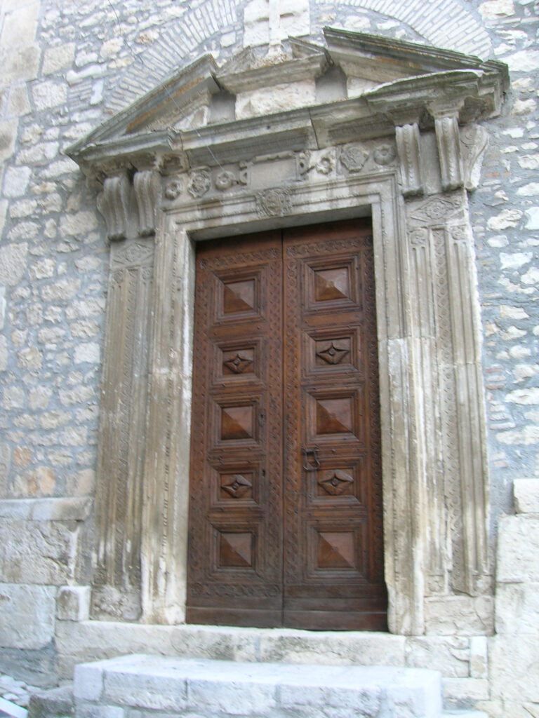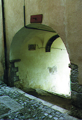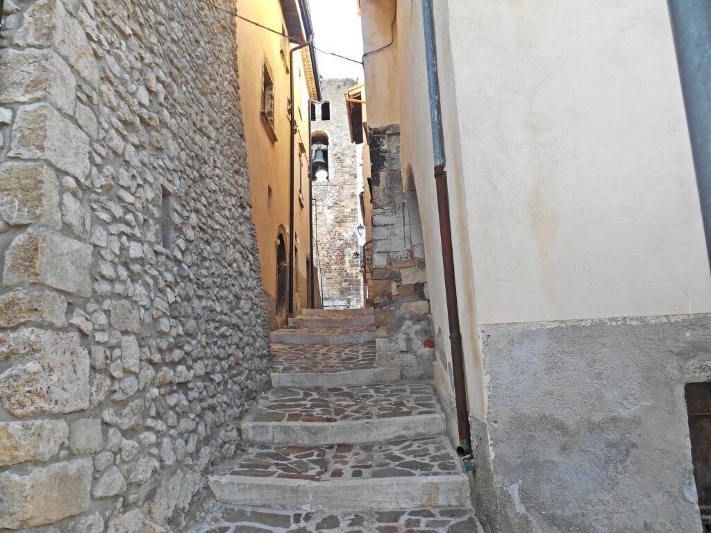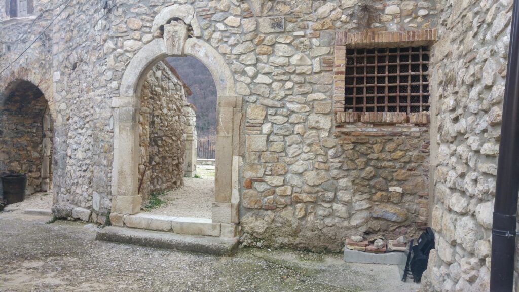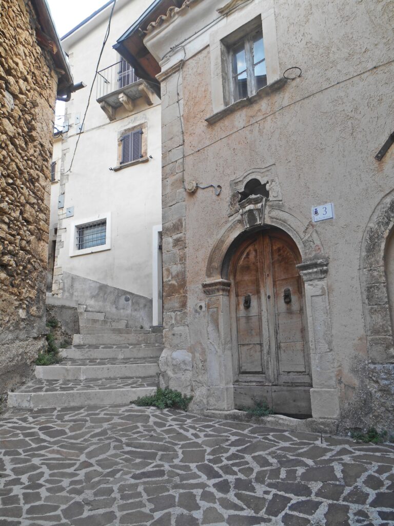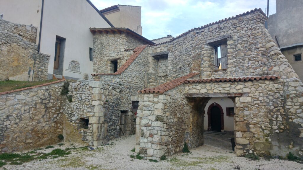 La strada prosegue in salita, inoltrandosi all’interno di una delle zone più antiche del paese, come denotano le caratteristiche architettoniche dei palazzi: resti notevoli di archi, passaggi e stradine interne e bellissimi esempi di portali decorati restano a testimonianza di un passato che ha straordinariamente conservato l’antico tessuto urbano.