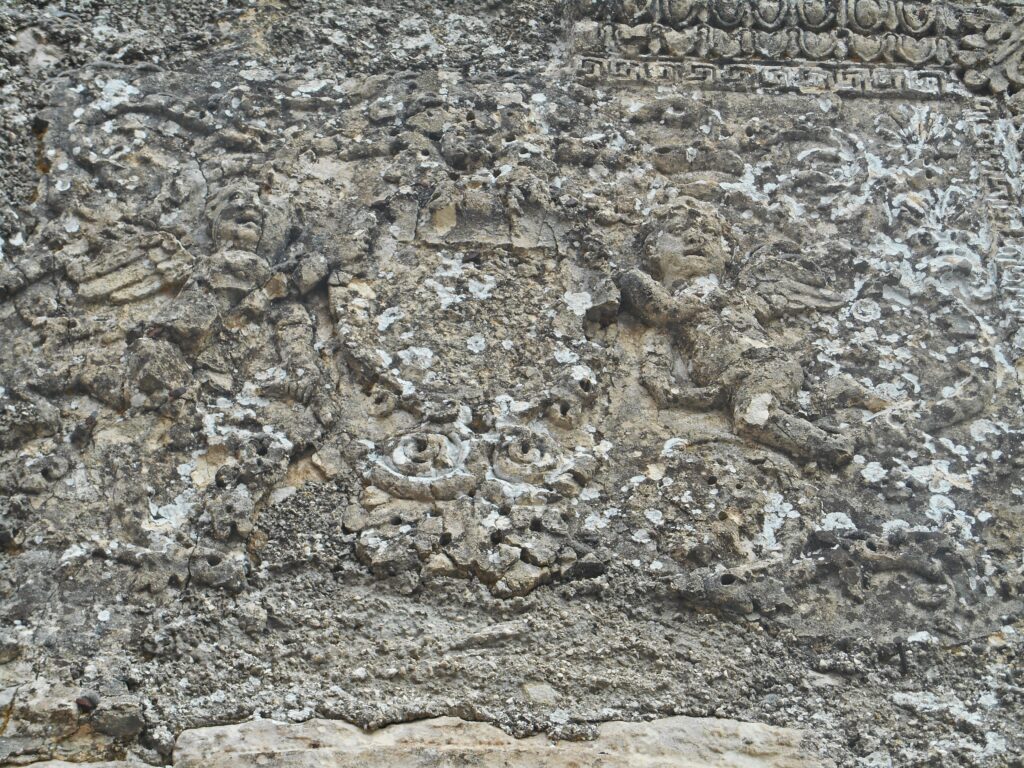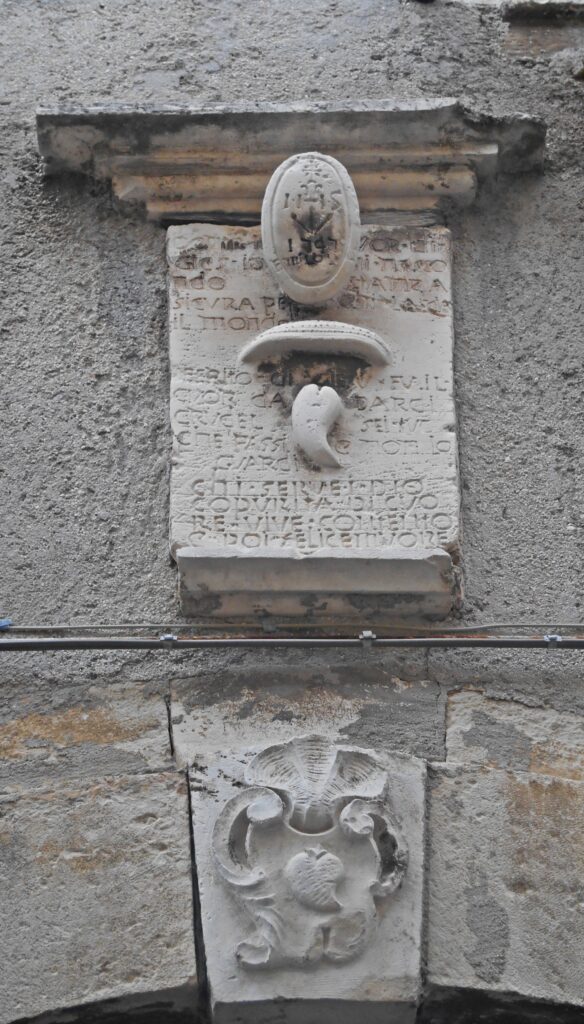 Dalla chiesa si sale lungo via Porta Ruggeri; sul lato sinistro del santuario si trova un piccolo edificio con porta ad arco e due parapetti laterali, tipica struttura delle botteghe medievali e rinascimentali. Al di sopra dell’arco è visibile, anche se assai rovinato, un bassorilievo di stile barocco, rappresentante due amorini che sorreggono uno stemma, contornati da girali floreali.