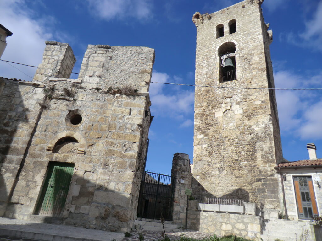 La torre è senza dubbio l’elemento architettonico più conservato e più importante di tutto il borgo fortificato, databile al XII secolo: sorta nel punto più alto del paese (per rispondere ad esigenze difensive e di avvistamento), è a base quadrata e costruita in grossi blocchi di pietra squadrati; la parte superiore mostra ancora alcuni beccatelli aggettanti, più conservati nei lati retrostanti e segno di una parte superiore sporgente all’esterno. Le aperture maggiori sui lati vennero create per alloggiare le campane quando la torre, perse le sue caratteristiche di fortilizio, venne utilizzata come campanile della attigua chiesa di San Nicola.