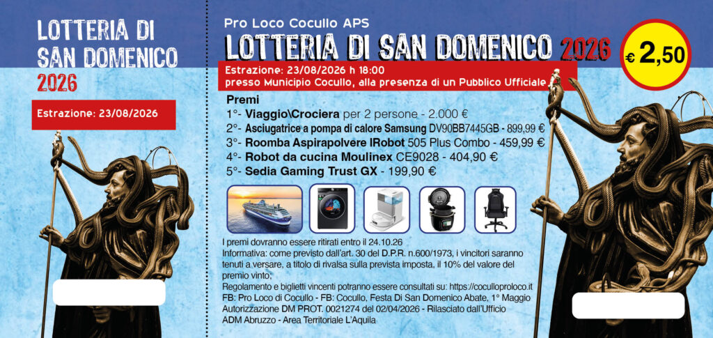 I premi dovranno essere ritirati entro il 24.10.26, contattando l’associazione Pro Loco di Cocullo APS. Scaduto tale termine, il vincitore perderà il diritto al ritiro del premio che resterà di proprietà dell’associazione.